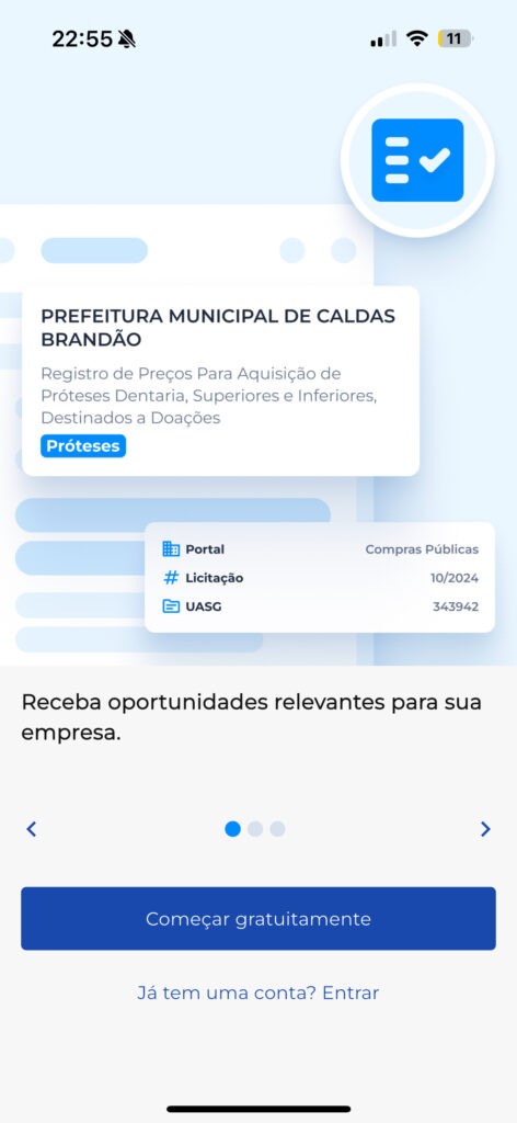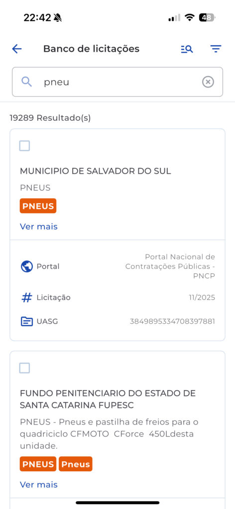 - Banco de licitações: exibe até 30 resultados por busca, detalhes da licitação são bloqueados (funcionalidade liberada apenas na versão paga do aplicativo).