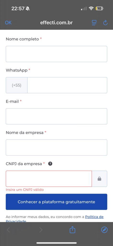 - O sistema bloqueia o cadastro com e-mail ou CNPJ já cadastrados como clientes Effecti.