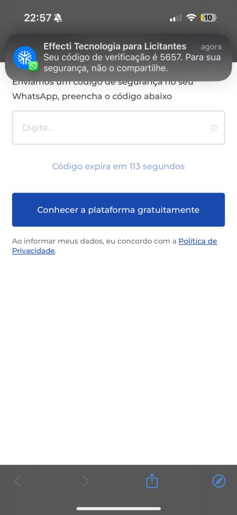Após informar seus dados, você receberá um código de verificação via WhasApp. Insira este código no campo indicado e clique em “Conhecer a plataforma gratuitamente“.