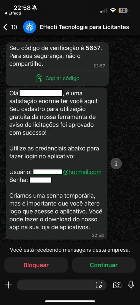 Após a verificação, você receberá por WhatsApp e e-mail, o usuário e senha provisória para realizar o primeiro acesso.