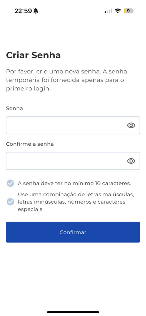 No primeiro acesso, você deverá criar uma nova senha definitiva para sua segurança. Esta deve conter no mínimo 10 caracteres com letras maiúsculas, minúsculas, números e caracteres especiais.