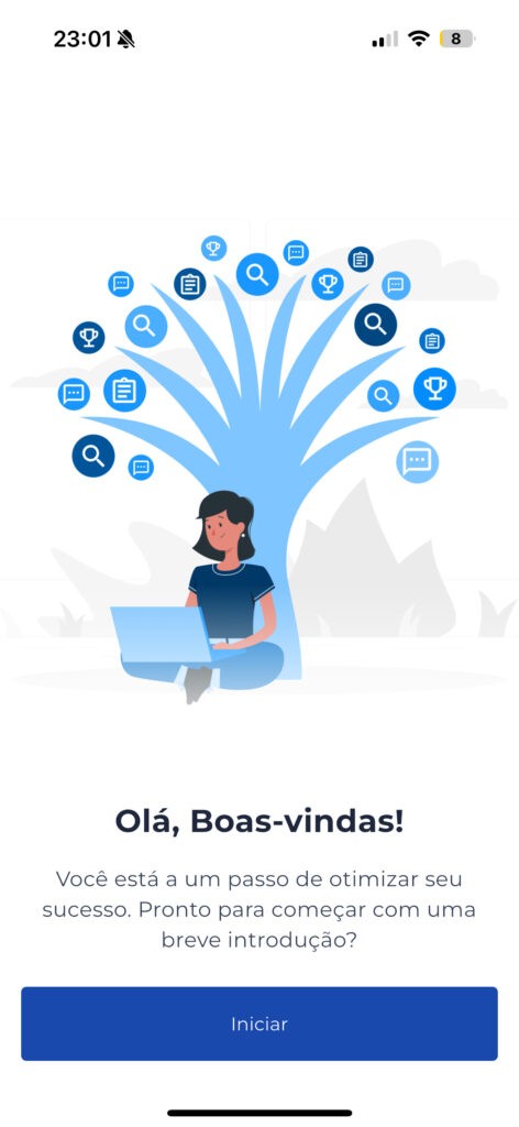 Após concluir o cadastro, você será direcionado para uma breve introdução, onde será necessário realizar uma pré-configuração de acordo com a sua necessidade. Cliente em “Iniciar“.