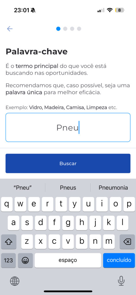 Nessa primeira etapa, você deverá indicar uma palavra-chave, que se refere ao termo principal do que está buscando nas oportunidades. Para o sucesso da sua configuração inicial, certifique-se de que seja uma palavra única. Em seguida, clique em “Buscar“.