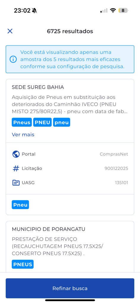 Após indicar a palavra-chave, você terá acesso à uma amostra de 5 resultados que encontramos de acordo com a palavra-chave indicada. Confira essas oportunidades clicando em “Ver mais” para entender se esta é a palavra que você realmente procura e clique em “Refinar busca“.
