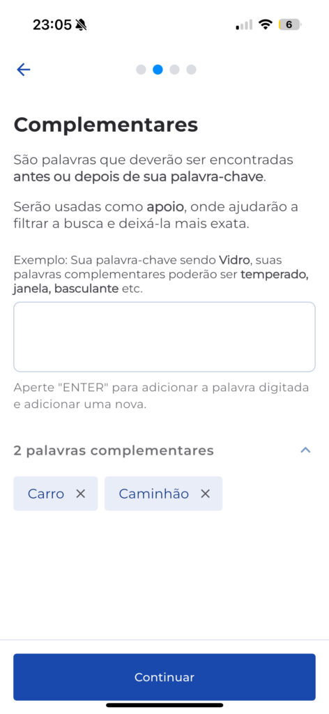 Aqui é a fase onde você fará o refinamento da sua pesquisa, indicando palavras complementares que ajudarão a filtrar a busca e deixá-la mais exata. Esse refinamento nessa fase de configuração inicial é obrigatório, portanto você pode incluir uma ou mais palavras de acordo com a sua necessidade. Clique em “Continuar“.