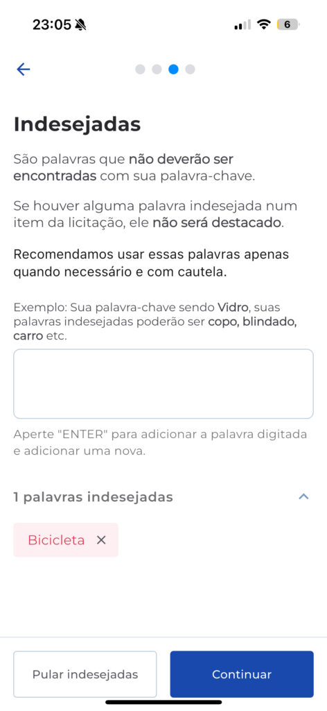 Para finalizar a configuração da sua palavra-chave, você também poderá indicar palavras indesejadas que garantirão o não recebimento de oportunidades fora do seu interesse. Se houver alguma palavra indesejada em algum item da licitação, esta oportunidade não será destacada para você. Ressaltando que esta configuração é opcional, você pode avançar indicando uma ou mais palavras indesejadas ou sem indicar nenhuma. Clique em “Pular indesejadas” (caso não queira utilizar) ou “Continuar” (caso tenha adicionado palavras) para avançar.
