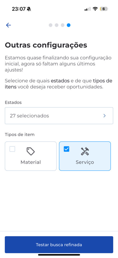 Finalize as configurações iniciais selecionando em quais estados deseja buscar por oportunidades e o tipo de item comercializado por você, se material ou serviço, ou ambos. Clique em “Testar busca refinada“.