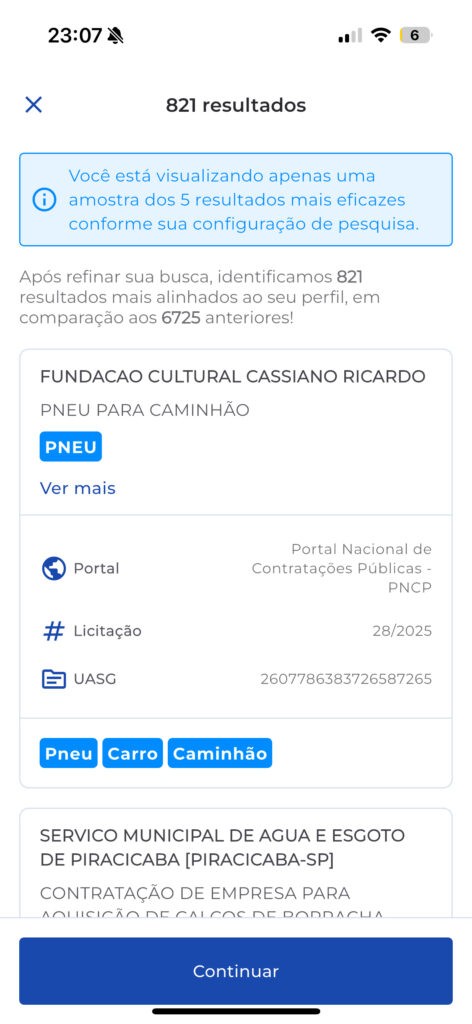 Aqui você terá acesso à uma nova amostra de 5 resultados que encontramos de acordo com a sua configuração inicial. Confira essas oportunidades clicando em “Ver mais” para garantir que você receberá oportunidades apenas dentro do seu escopo de fornecimento. Em seguida, clique em “Continuar“.