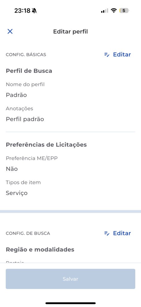 3 -> Em Configuração de Busca, você conseguirá ajustar as suas configurações de perfil e específicas, como modalidade, localidade, tipos de itens e etc. Aqui você conseguirá também adicionar, editar ou remover suas palavras-chave.