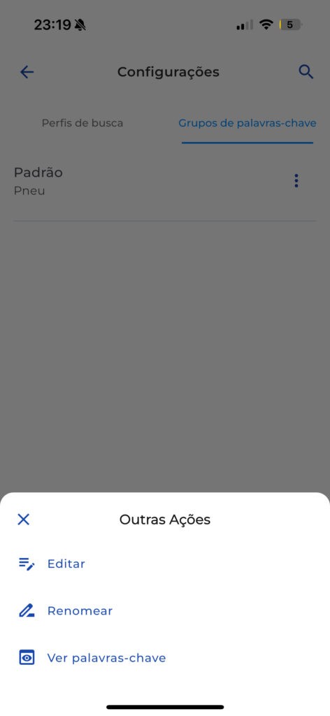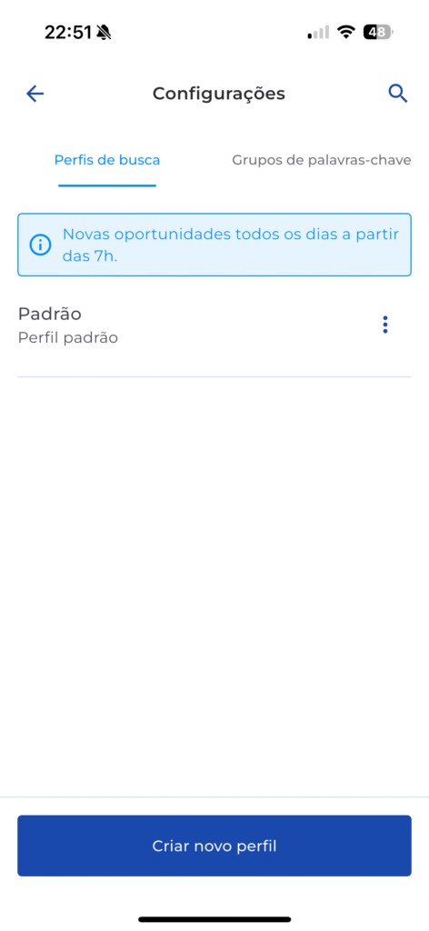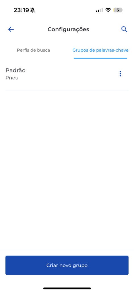 Na versão gratuita do app, você poderá cadastrar 1 perfil de busca e 1 grupo com até 15 palavras-chave. Confira abaixo como configurar seus filtros de busca: