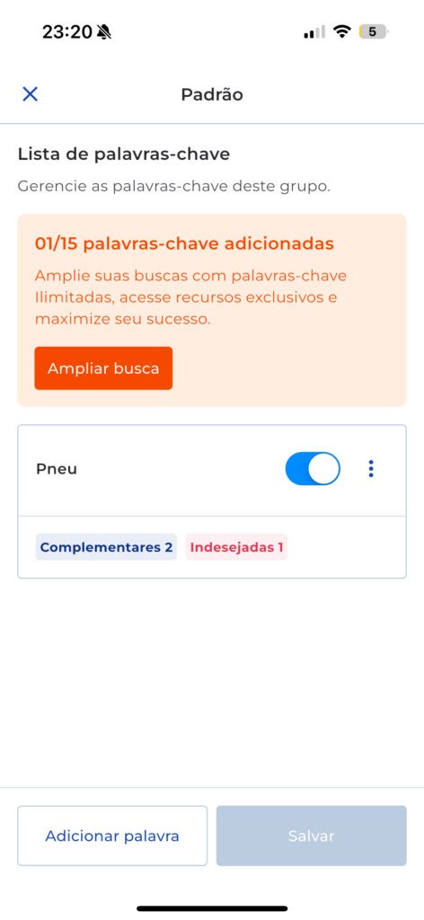 - Limite de 1 perfil e 1 grupo de palavras-chave (sem possibilidade de exclusão).