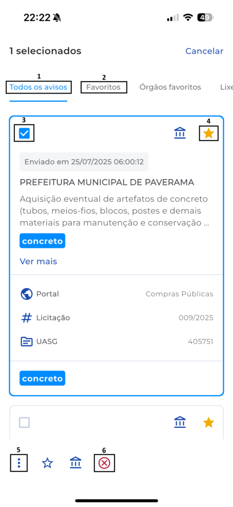 4 -> Quando o ícone “estrela” estiver destacado em amarelo, significa que você favoritou esta licitação. Você também a encontrará na aba “Favoritos”.