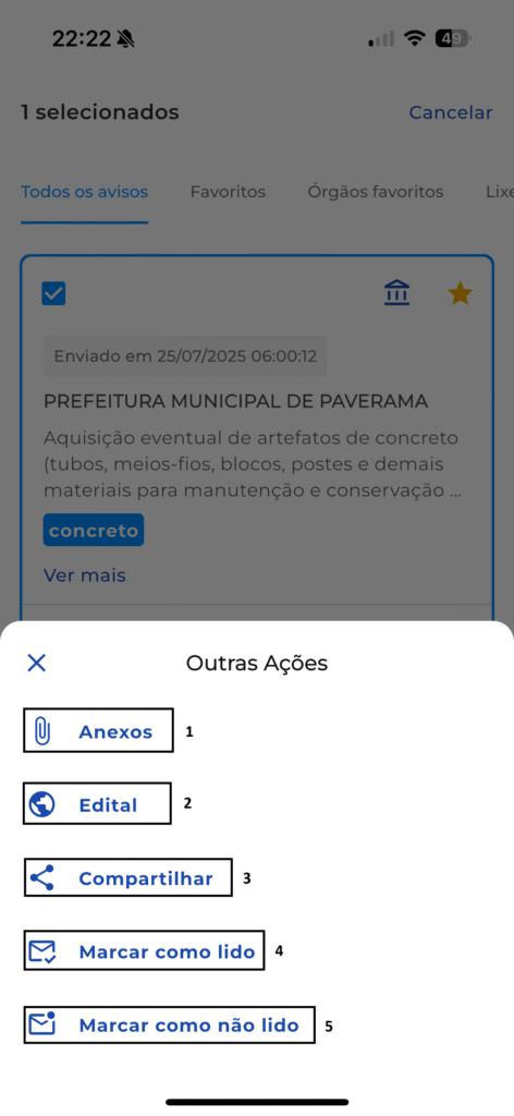 3 -> Ao preencher a “caixa” no canto superior esquerdo da licitação, você consegue selecionar essa e outras licitações para realizar mais ações.