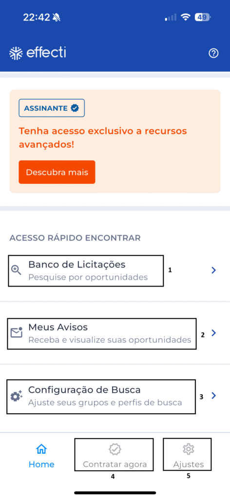 1 -> Acesso à funcionalidade Banco de Licitações. Esta funcionalidade exibe todas as licitações coletadas pela plataforma Minha Effecti dos últimos 6 meses, permitindo que você encontre novas oportunidades, independentemente das suas configurações personalizadas. Na versão gratuita do app, você conseguirá pesquisar por palavra e obter até 30 resultados por busca, no entanto, os detalhes da licitação são bloqueados (funcionalidade completa liberada apenas na versão paga do aplicativo).