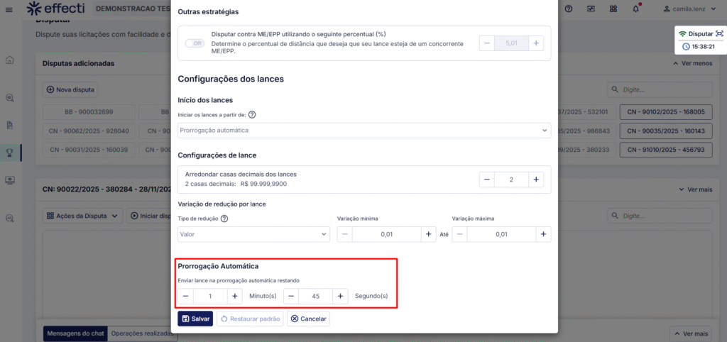 Por padrão o disputar já vem configurado para enviar lances na prorrogação automática, faltando 1:45 segundos para encerrar a disputa. No entanto, você poderá alterar de acordo com as suas preferências.