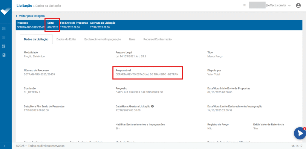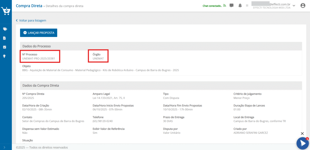 - Para dispensas, informe o número do processo (exemplo: UNEMAT-PRO-2025/20381) e o órgão (exemplo: UNEMAT). Para pregões, informe o número do edital (exemplo: 018/2025) e o responsável sem a sigla de abreviatura (exemplo: DEPARTAMENTO ESTADUAL DE TRÂNSITO).