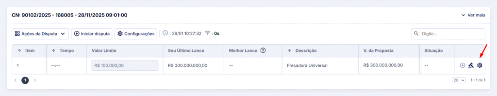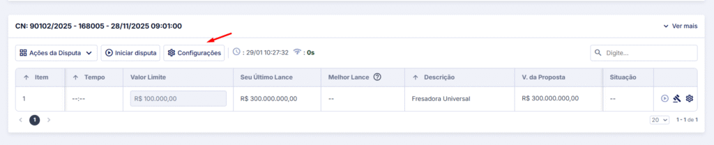 3. Irá abrir a tela com as informações da disputa, clicar em Configurações.