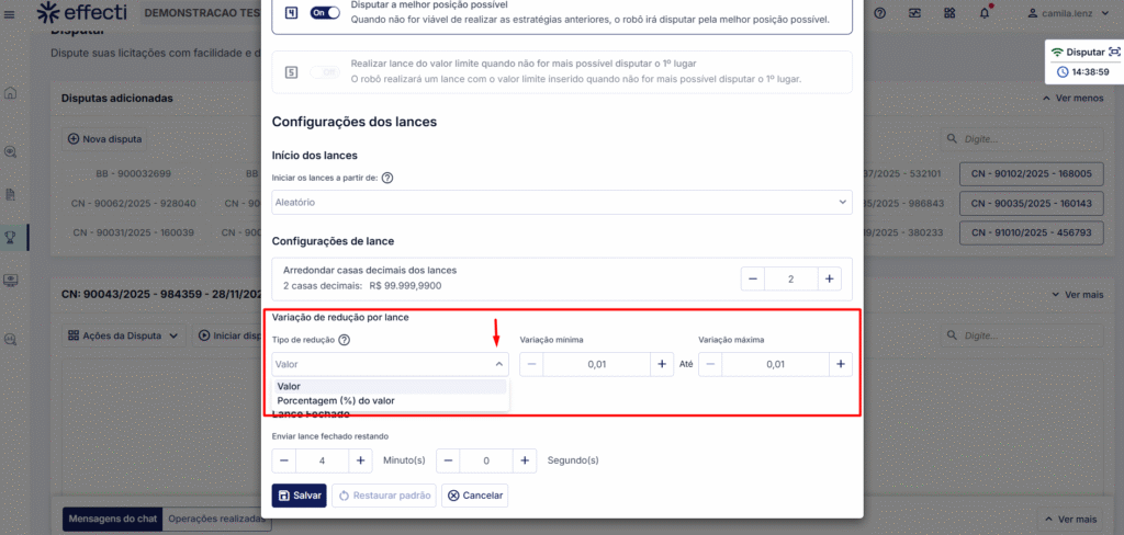 • Em alguns processos, o intervalo de desconto já é estabelecido pelo pregoeiro e pode ser em valor ou percentual. Se você configurar um intervalo de desconto menor do que o estipulado pelo portal, o robô utilizará a configuração do portal para enviar os lances.