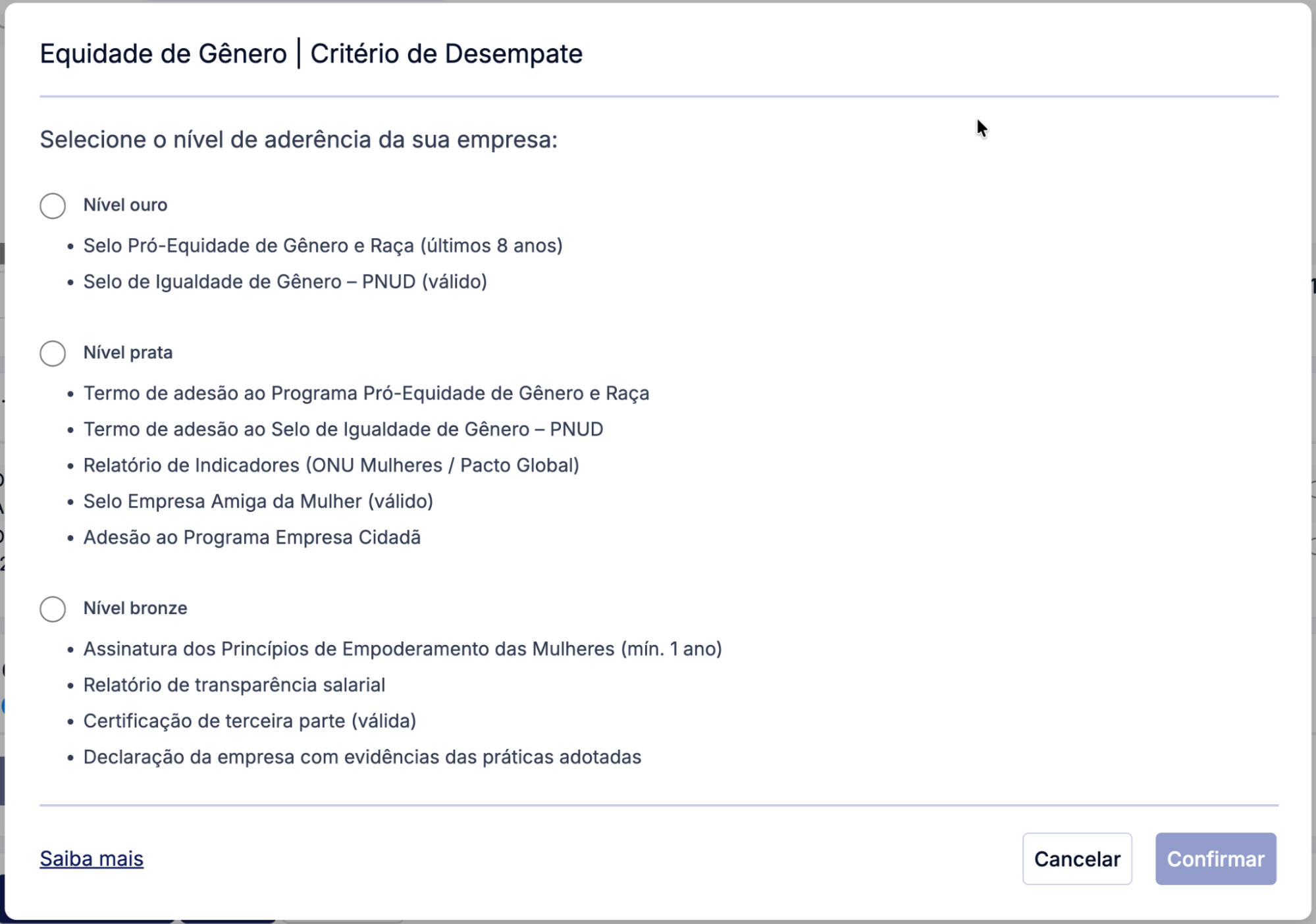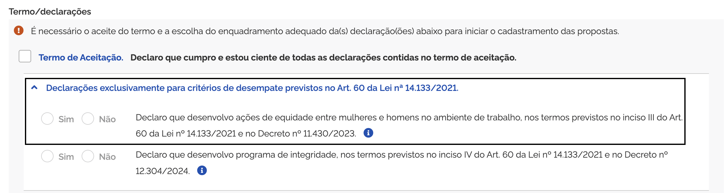 No cadastro da proposta, algumas licitações exigem a declaração sobre ações de equidade entre mulheres e homens no ambiente de trabalho.