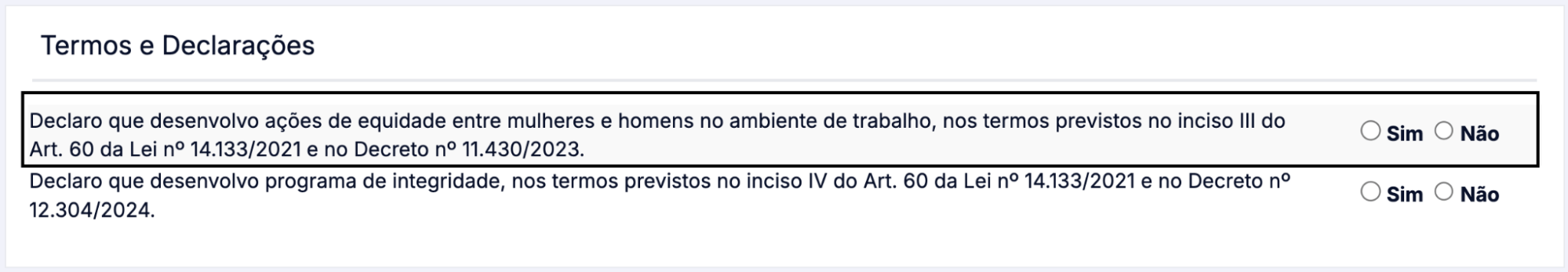 Declaro que desenvolvo ações de equidade entre mulheres e homens no ambiente de trabalho, nos termos previstos no inciso III do art. 60 da Lei nº 14.133/2021 e no Decreto nº 11.430/2023.