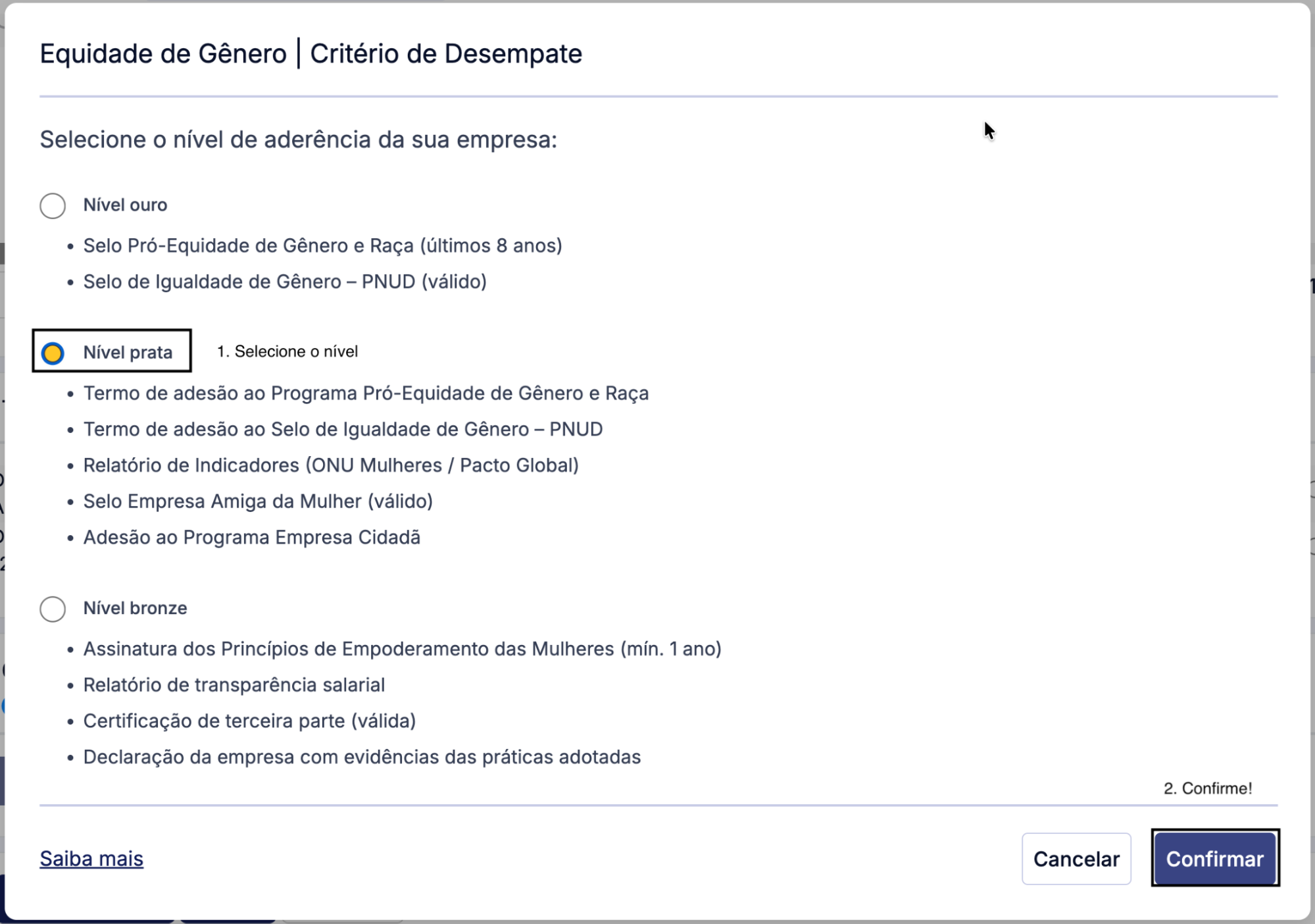 ⚠️ Ao selecionar um nível, o fornecedor declara que possui os documentos comprobatórios correspondentes.
