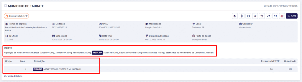 A palavra-chave é a base inicial para a filtragem dos avisos de licitação, sendo procurada tanto no objeto da licitação quanto em seus itens correspondentes. Por exemplo, ao cadastrar a palavra-chave “Insulina”, o sistema enviará oportunidades, como o exemplificado abaixo: