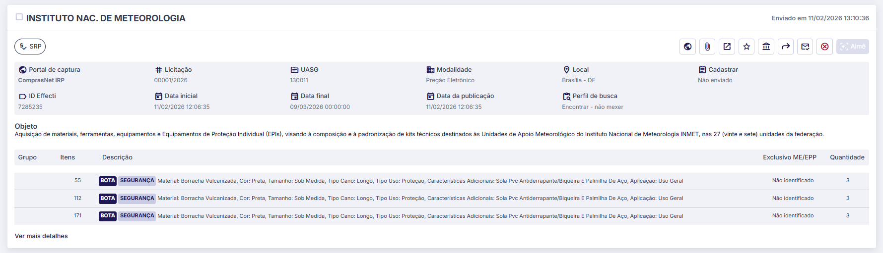 Por exemplo, ao cadastrar a palavra-chave “bota” e a palavra complementar “segurança”, o sistema enviará oportunidades, como exemplificado abaixo: