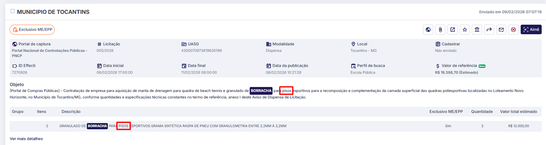 Nesse exemplo abaixo, a palavra PISOS está no item e no objeto que contém palavra-chave, então não será enviado o aviso de edital: