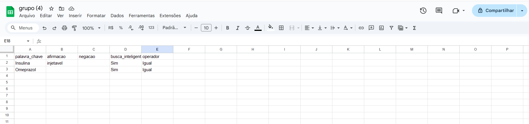 Criando o grupo de palavras-chave: