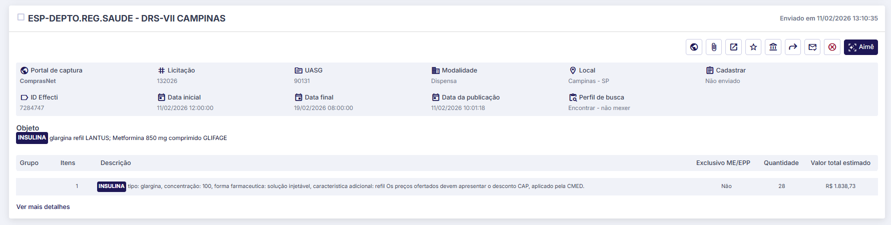O modo de busca “Precisa” filtra os avisos que contenham exatamente a palavra-chave que você cadastrou. Por exemplo, ao cadastrar a palavra “insulina”, o sistema enviará oportunidades que correspondam exatamente a essa palavra, como exemplificado a seguir: