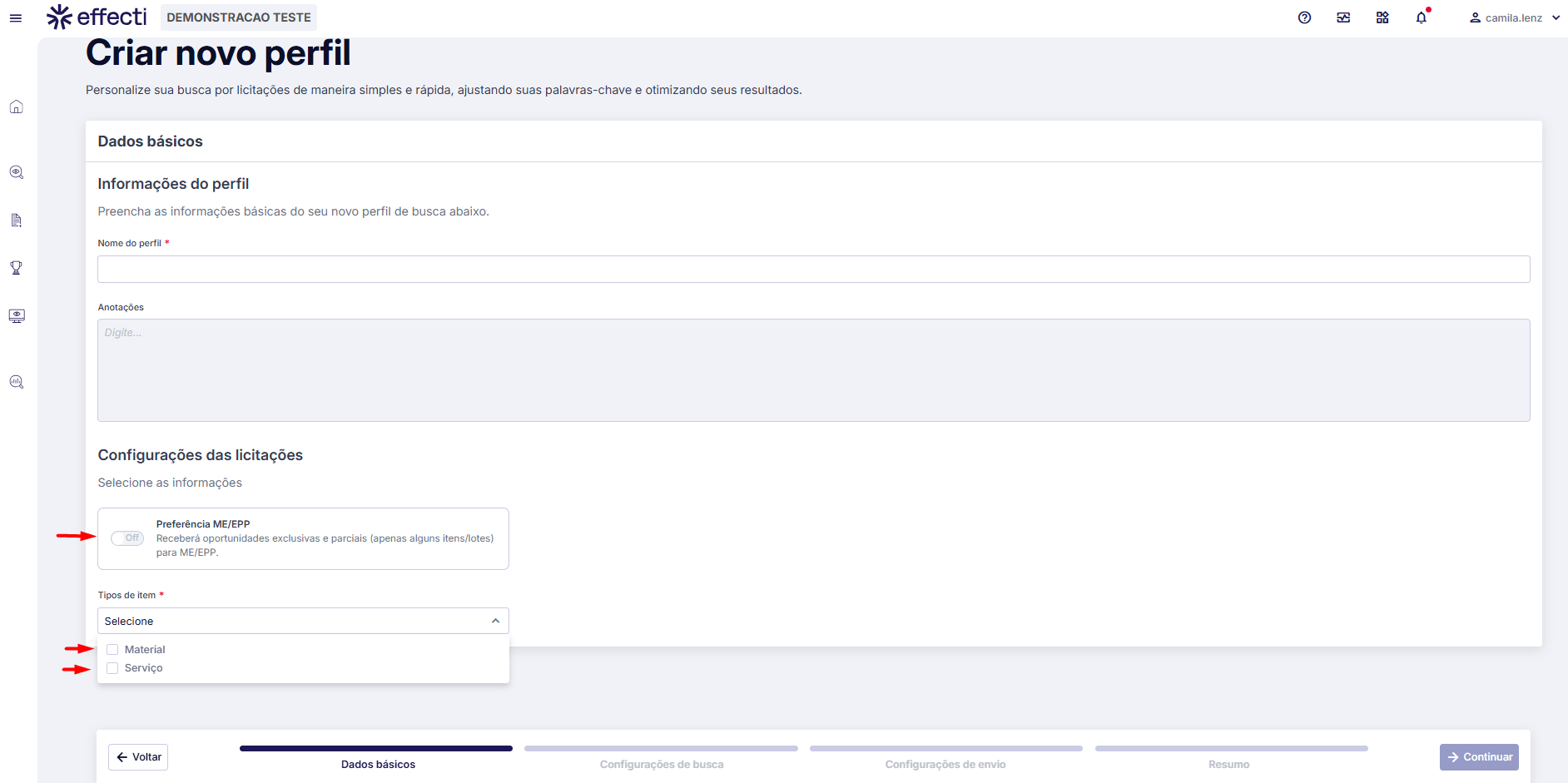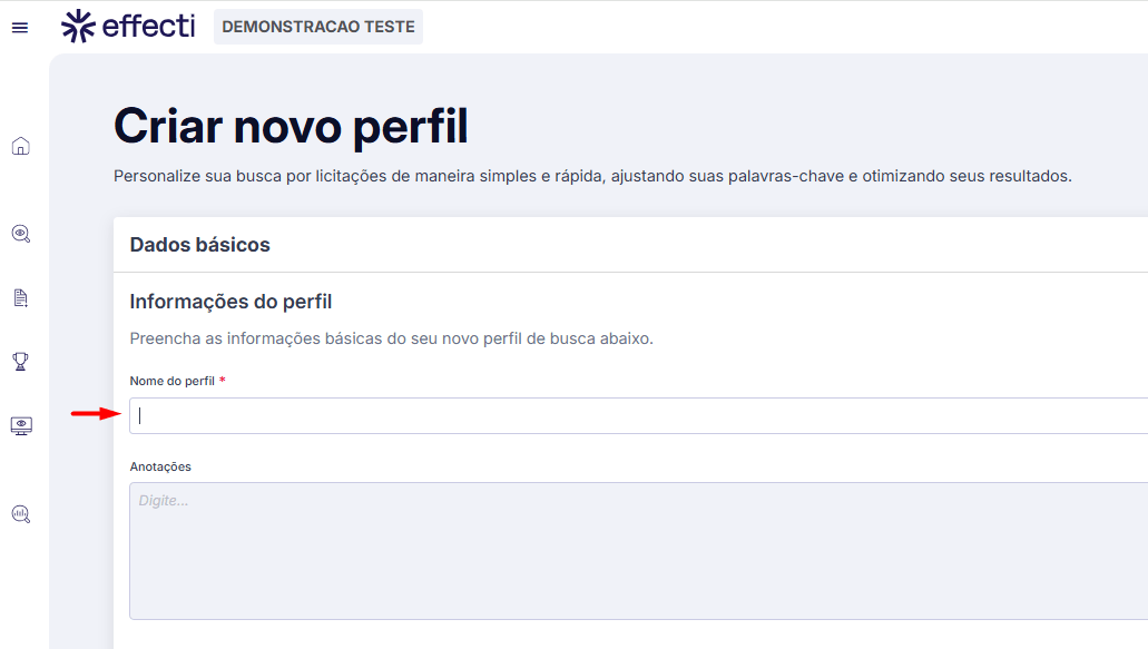 - Em anotações, é possível descrever mais sobre o perfil de busca que está configurando. Exemplo: Esse perfil é usado para encontrar licitações de medicamentos somente da região Sul.