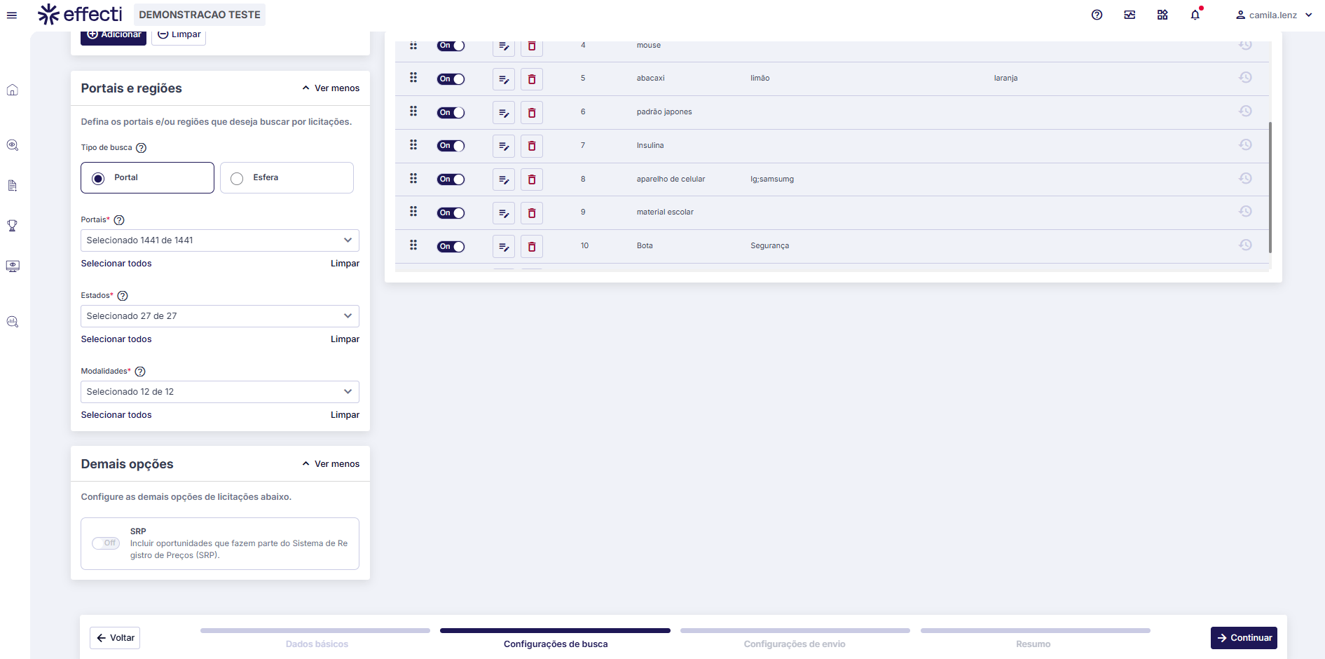 - Na seção Demais opções, é possível escolher se deseja Incluir oportunidades que fazem parte do Sistema de Registro de Preços (SRP).