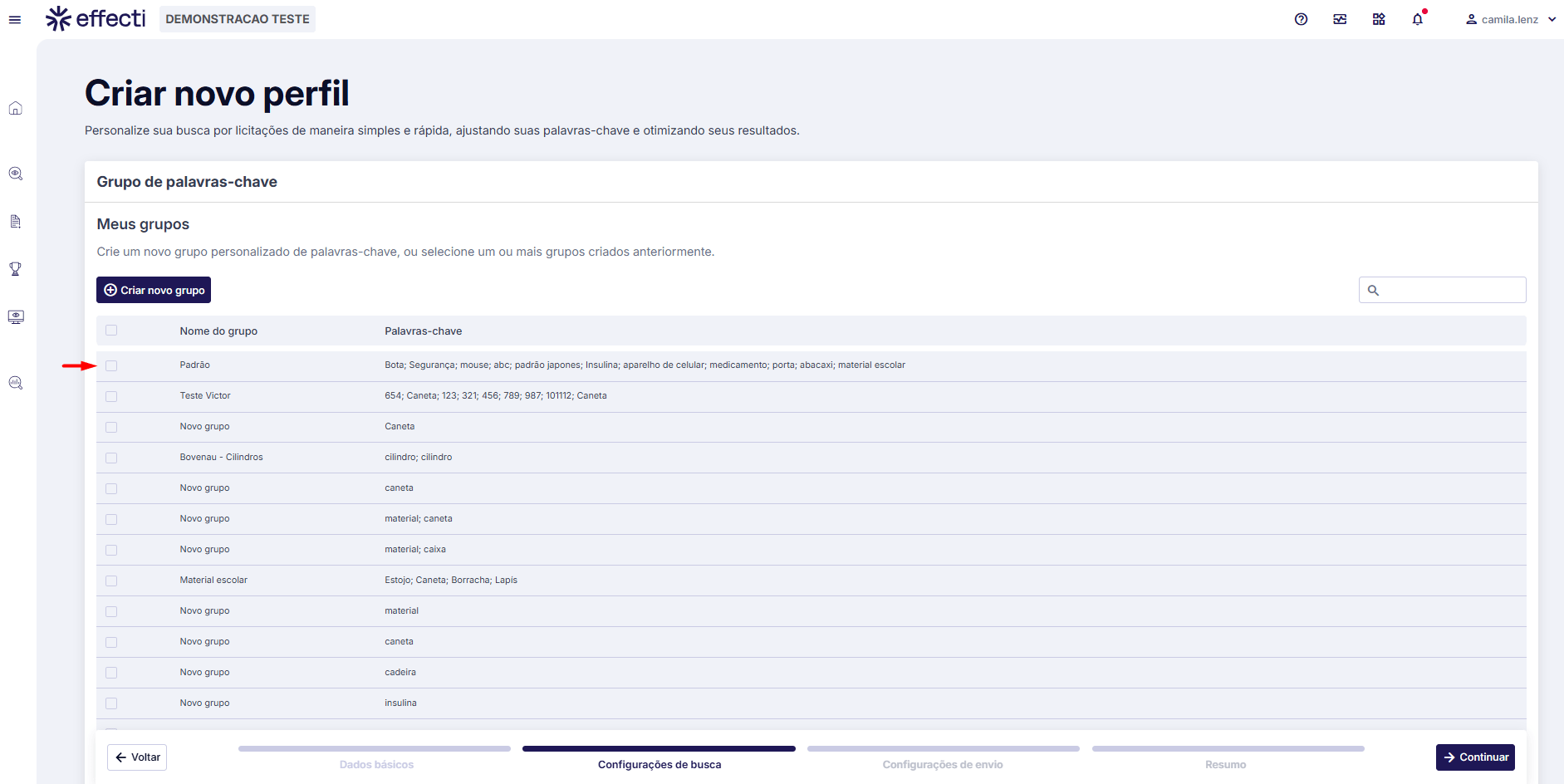 - Na seção “Grupos de Palavras-Chave”, selecione os grupos que deseja adicionar ao perfil. Se não houver Grupo de palavras-chave cadastrado, é possível criar nessa página um grupo.