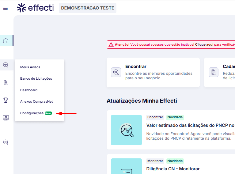 - Acesse o menu lateral esquerdo e clique no ícone de Lupa > Configurações.