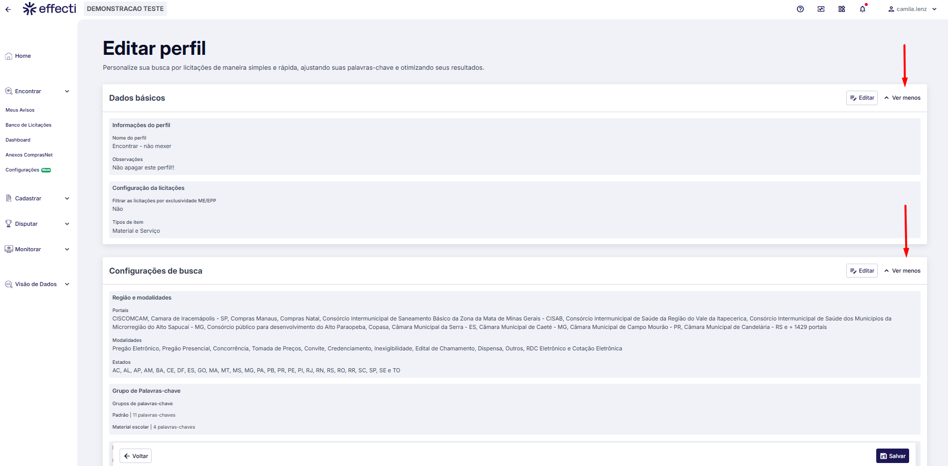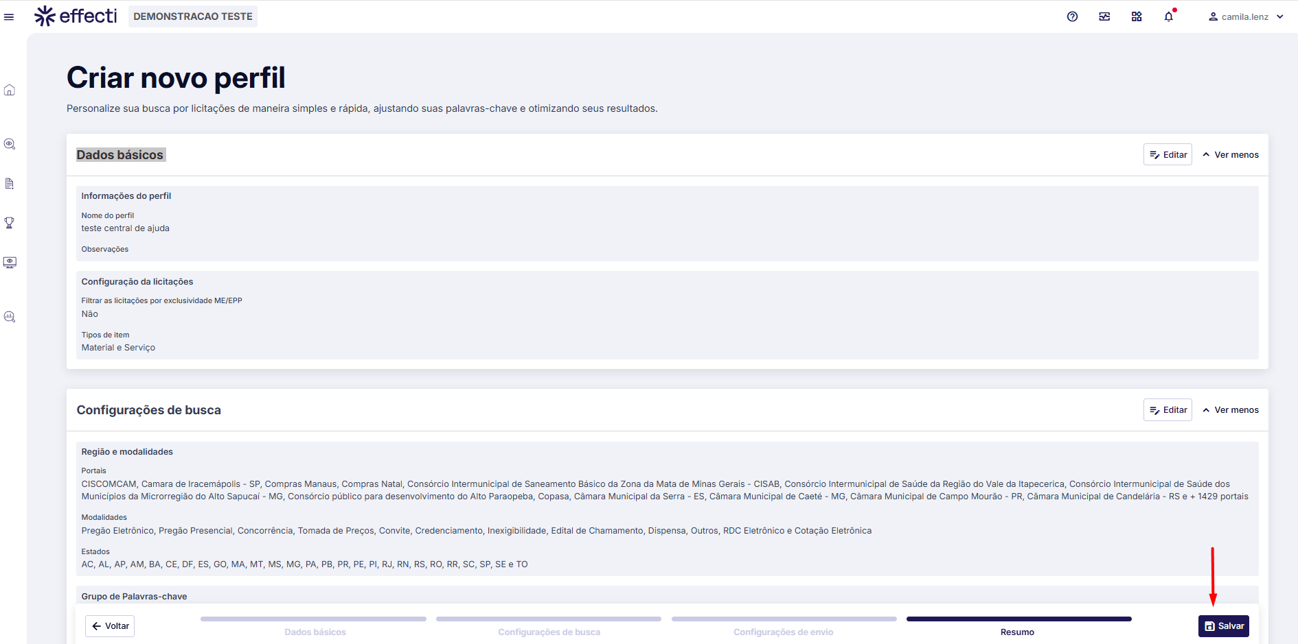 De forma agrupada, todas as configurações feita para o perfil, assim como dados básicos, configurações de busca e configurações de envio, mostrará detalhado cada informação configurado.