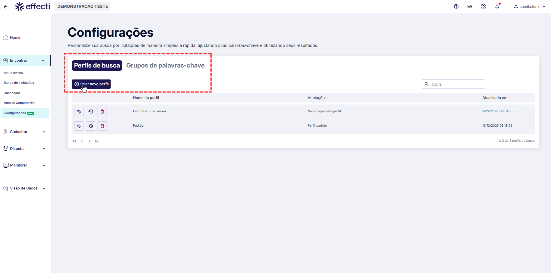 Perfis de busca: exibe a lista completa de todos os perfis de busca configurados na sua conta.