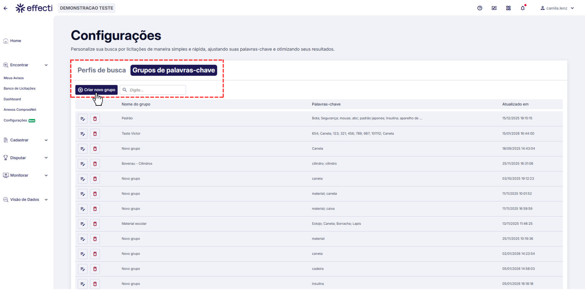 Grupos de palavras-chave: apresenta todos os grupos criados, organizados de forma prática dentro da aba correspondente.
