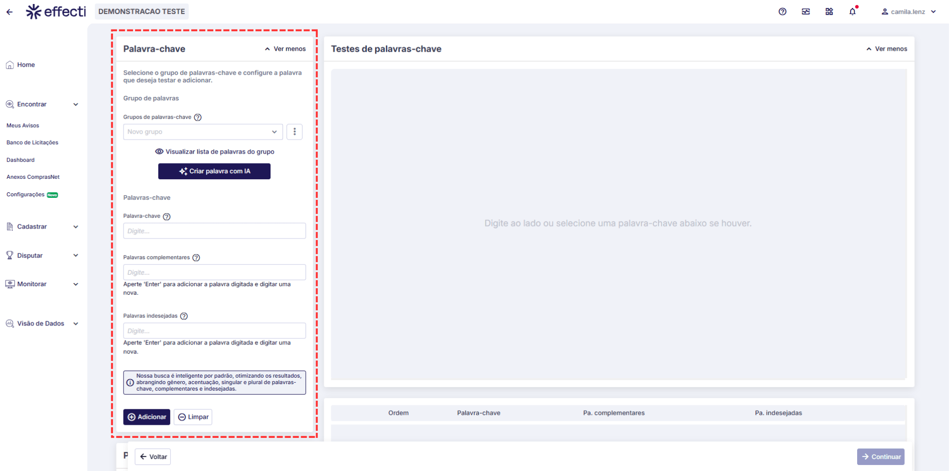 Ao Clicar em Criar novo Grupo, será direcionado para a tela de teste e criação novas palavras-chave para o grupo. Na próxima tela poderá tanto adicionar uma palavra-chave como as complementares e indesejadas se necessário.
