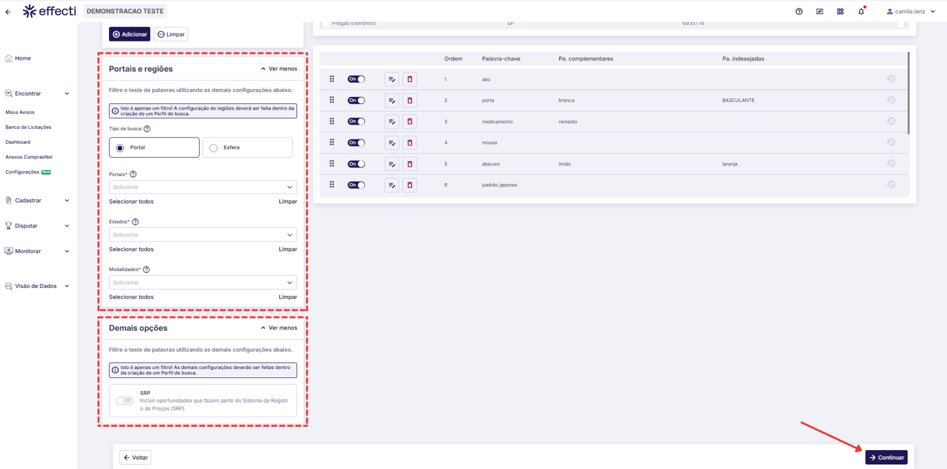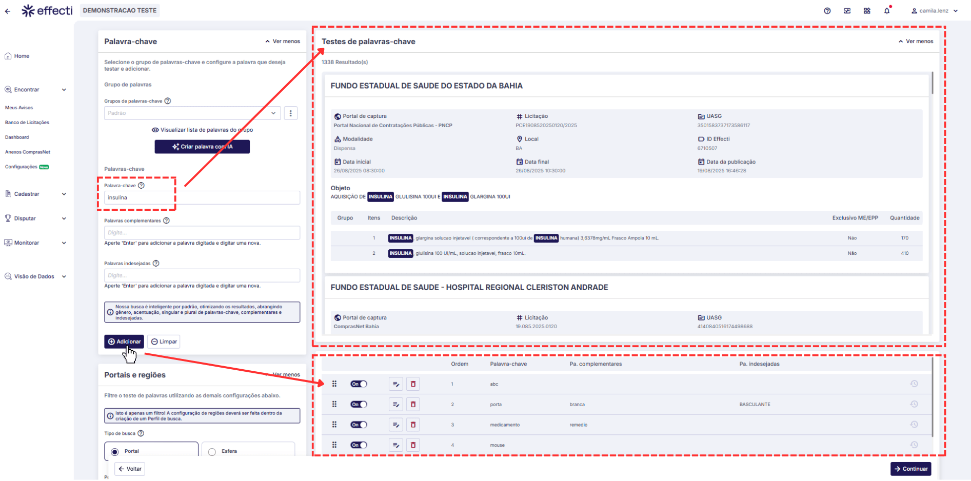 Enquanto o teste é realizado, todos os demais filtros ficam habilitados, portanto, poderá ver os resultados em diferentes portais, regiões ou esferas, assim terá uma visão completa e abrangente do termo pesquisado no teste.