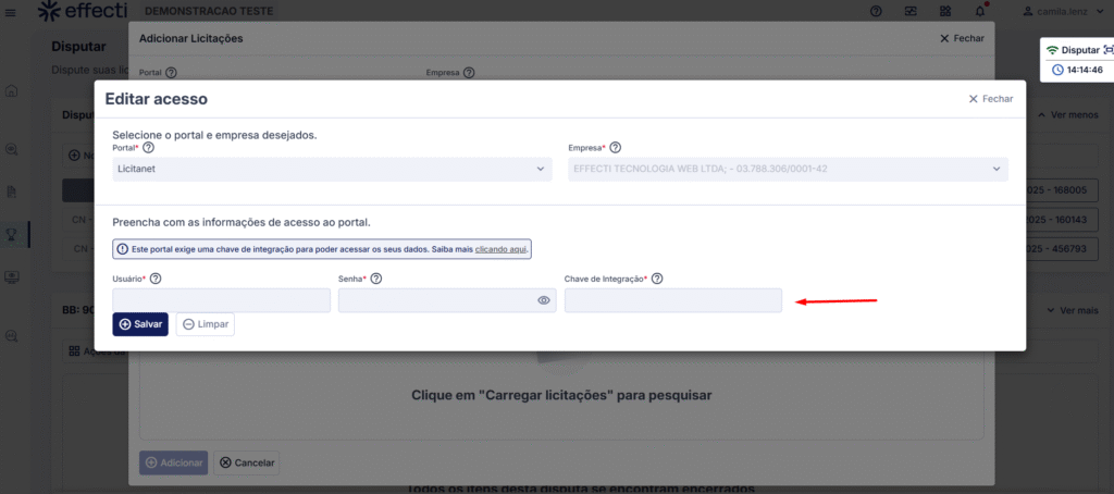 Como exemplo, no portal Licitanet é necessário informar: Usuário, Senha e Chave de integração.
