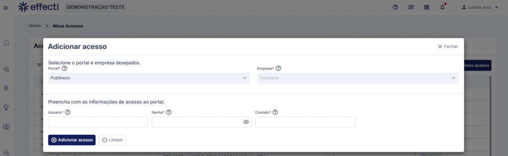 > Clique no botão Adicionar acesso. Em seguida, selecione o portal e a empresa para os quais deseja cadastrar o acesso.