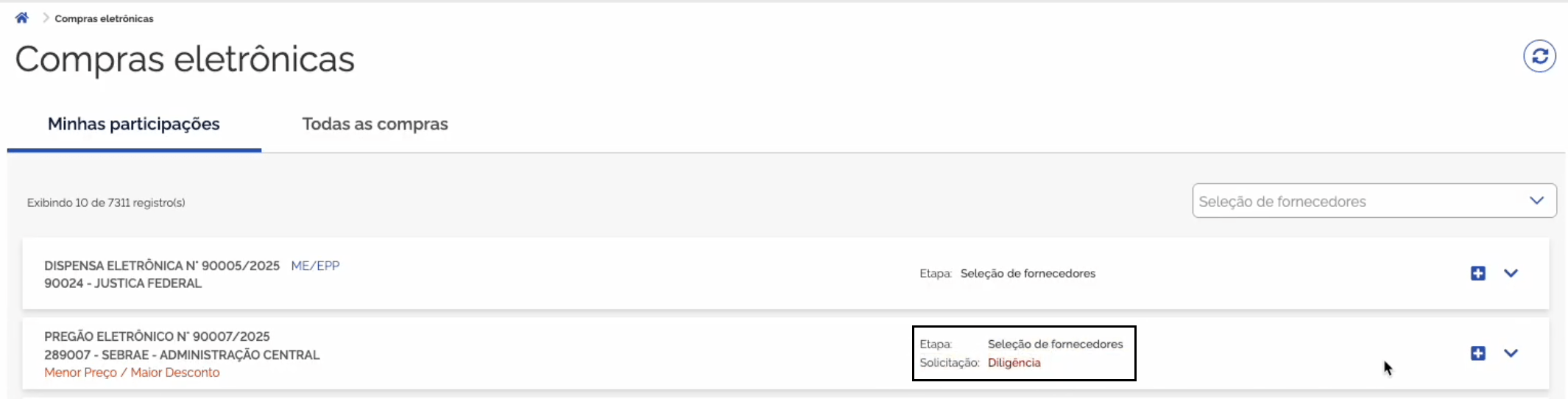 - Na lista de processos: Na tela “Minhas Participações”, os processos com diligências ativas são sinalizados com a situação “Solicitação: Diligência”.