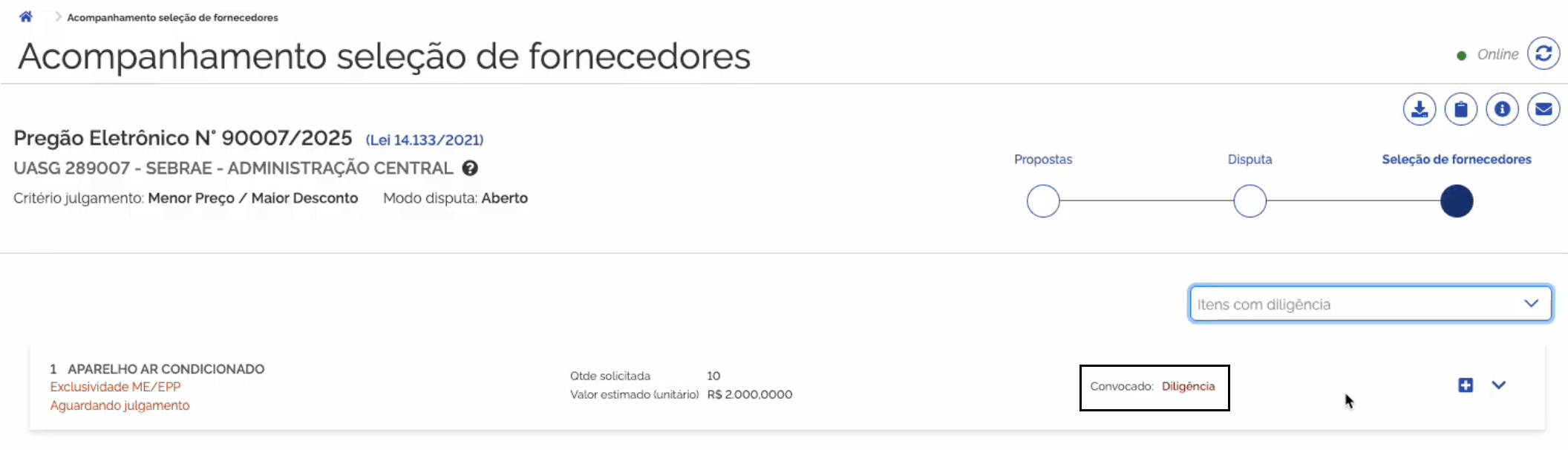 Item 3 – Diligência: Para CNPJ do fornecedor 12.345.678/0001-90: Mensagem enviada no campo Diligência > Mensagem.