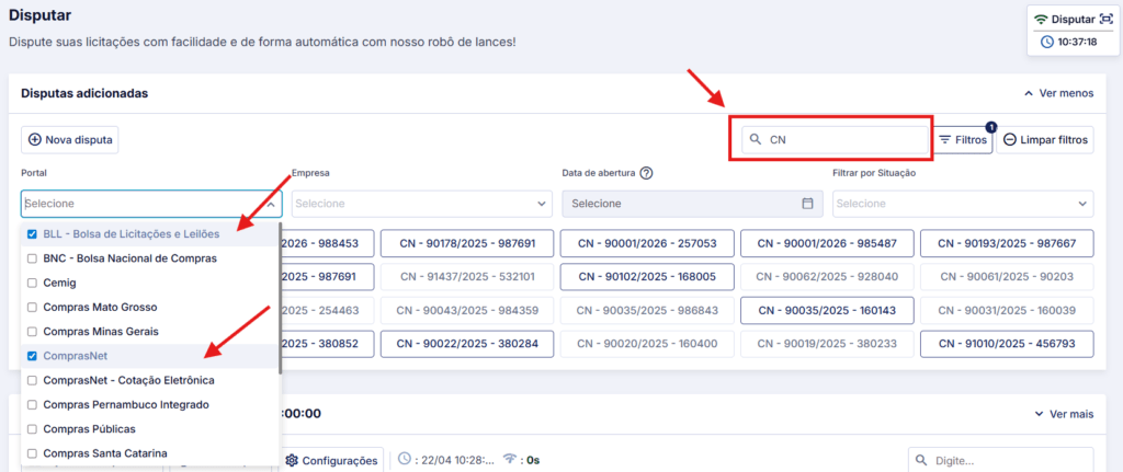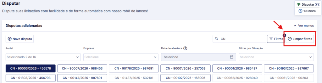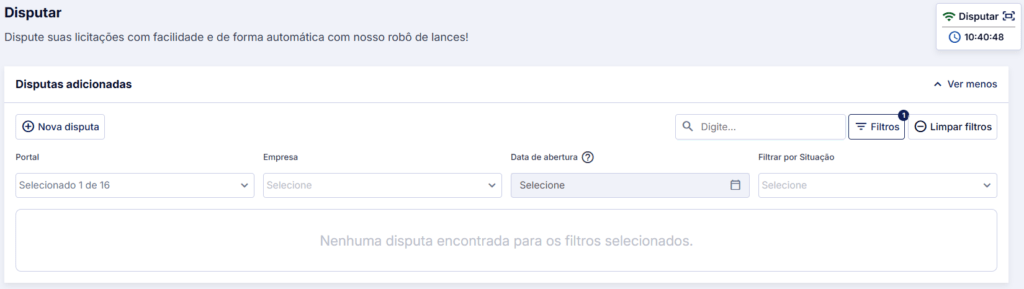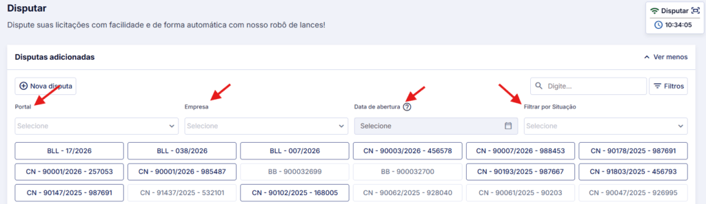 Os filtros permitem que você encontre rapidamente as disputas desejadas, refinando a visualização conforme diferentes critérios.