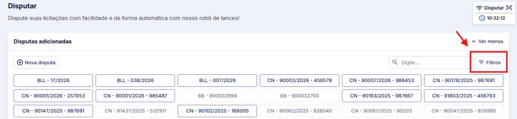 Ao acessar a tela Minhas Disputas, você verá o botão Filtros.