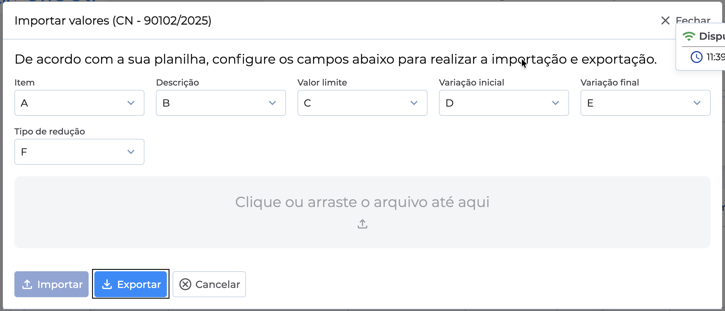 Na janela de importação, você encontrará a opção Exportar planilha. Essa é a planilha oficial do sistema — o cliente deve sempre usar este modelo.