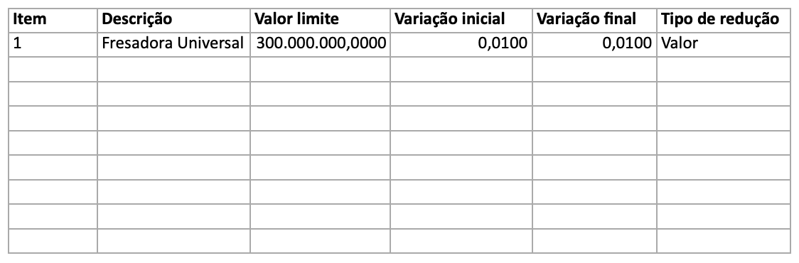 Este artigo explica como exportar o modelo de planilha, preencher os campos necessários e importar novamente para configurar valor limite, lance fechado e variações de desconto na disputa.