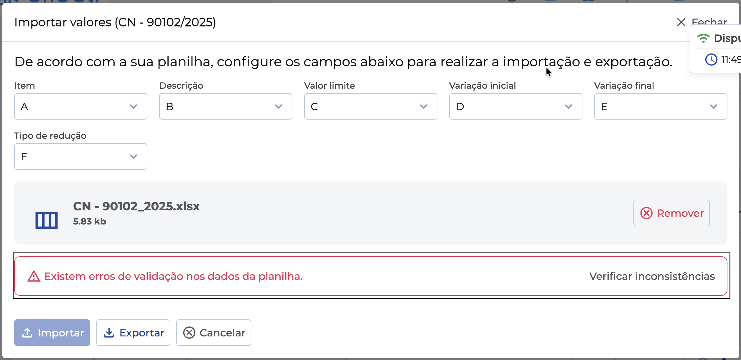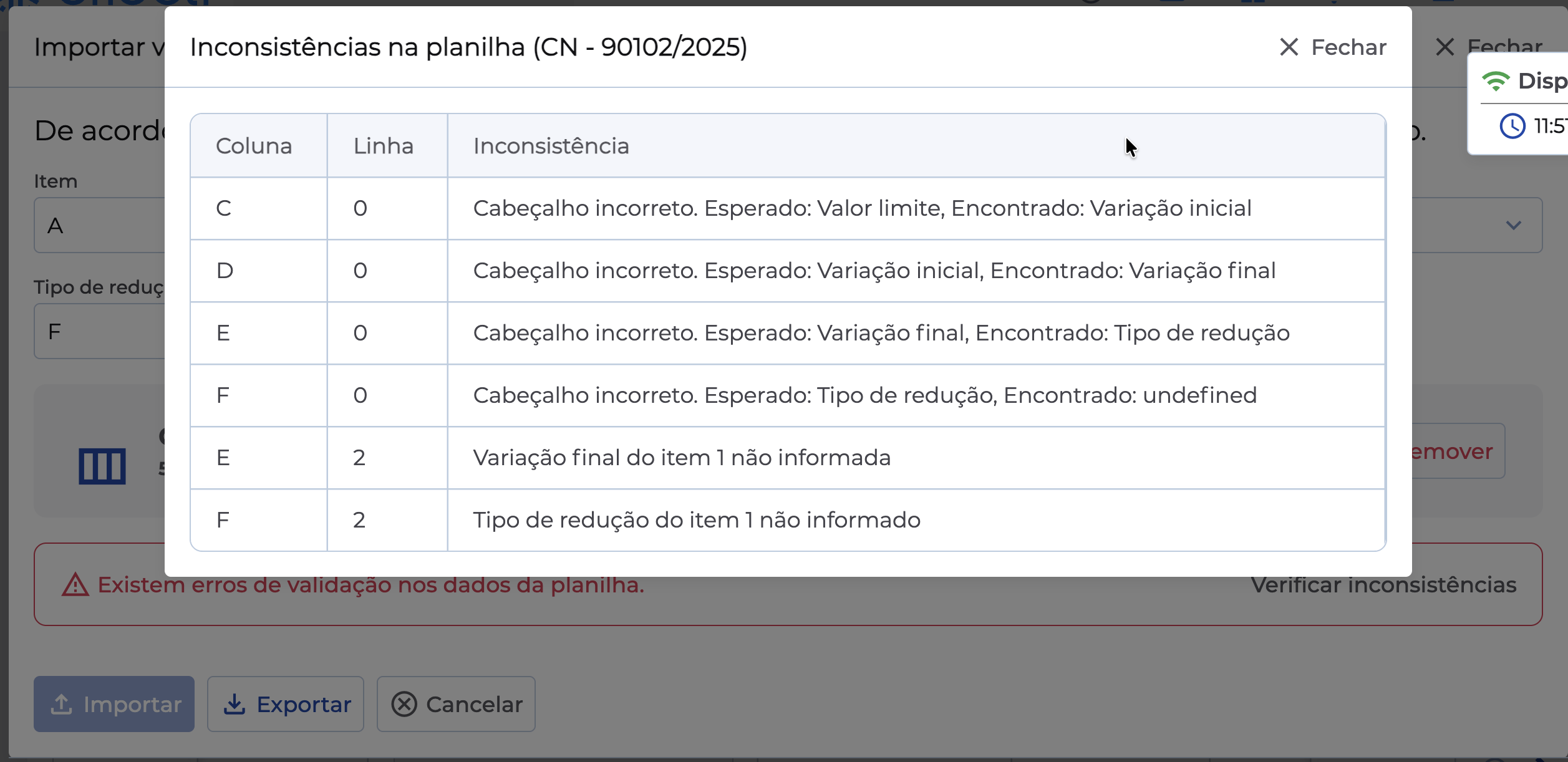 - Cabeçalho incorreto. Esperado: Valor limite, Encontrado: Variação inicial
