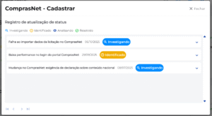 Ao interagir com a notificação, a plataforma exibirá uma janela modal com informações detalhadas do incidente, bem como o histórico de atualizações: