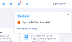 Assim que detectarmos uma instabilidade, você será notificado na própria plataforma. O alerta aparece no lado direito da tela, logo abaixo da barra superior, informando o portal afetado, a etapa impactada e o status atual: